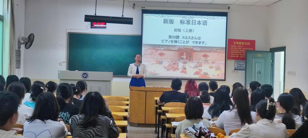 本次公开课的授课对象为英语21级学生,主要讲授了中国传统节日——春节的相关词汇和句型。课前,通过学习通发布了春节相关的话题,引导学生讨论春节的习俗并尝试用日语表述春节期间最喜欢做的事情,为本课的学习做好铺垫;课堂上,通过用日语说春节主要习俗的方式,导入本课的学习重点——动词基本形的用法,通过视频欣赏、举例讲解、句型练习、看图说话等多种方式,生动地阐述了如何用日语描述春节相关的中国传统文化。