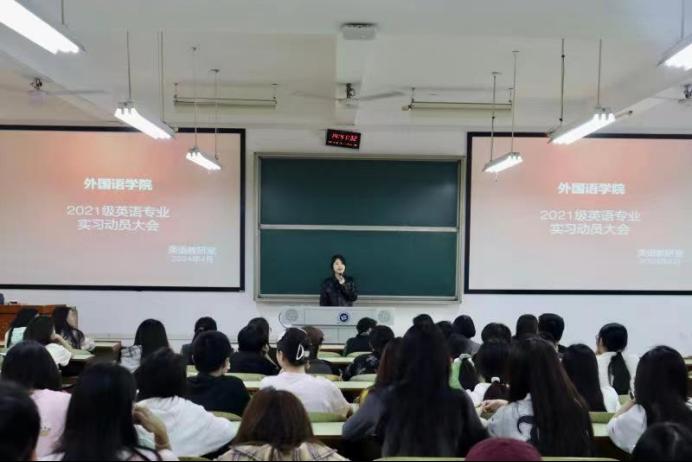 2024年4月19日下午14点40分,英语专业21级专业实习动员大会分别在主教学楼D401和南校区一教112举行,会议由系主任苏静博士主持,全体指导老师以及2021级全体同学(本部及应院共161名学生)到会。
