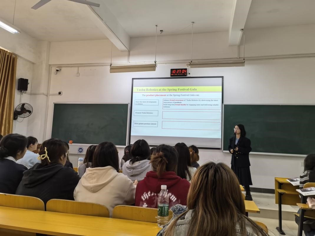 本次公开课以“Brands”(品牌)为核心主题,以“桑尼森迪在北美提升销售份额”为具体案例展开分析,聚焦商务英语会议实操、商务信件规范撰写两大教学内容,将语言知识学习与思政教育元素有机融合,呈现了一堂生动鲜活、兼具深度与温度的外语实践课。整堂课在积极互动的氛围中结束,不仅切实提升了学生的商务英语语言组织与应用能力,更让学生深刻领悟到中国品牌背后“坚持不懈、永不放弃”的精神内核,实现了语言素养与思想境界的双重提升。