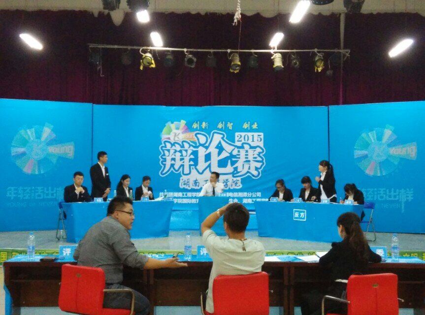 2015年4月28日晚七点,388vip太阳集团官网第十二届辩论赛第三场复赛在明德二食堂三楼的活动中心举行,388vip太阳集团官网和化学化工学院代表队参与了此次辩论。比赛特邀湘潭电视台法制频道制片人李军老师,湘潭电台交通频道主播高兴老师,湘潭市口才协会副会长彭英老师担任评委。