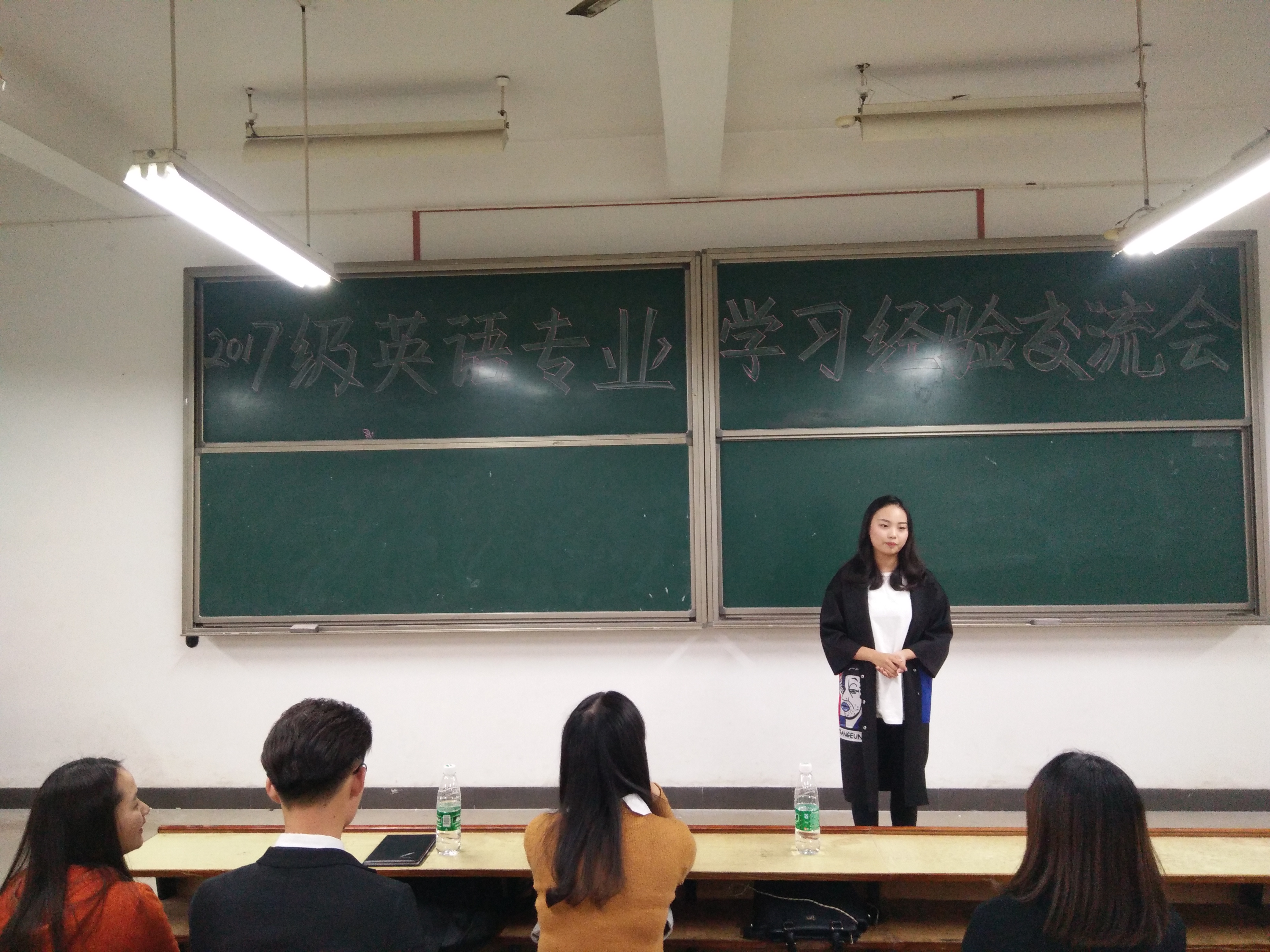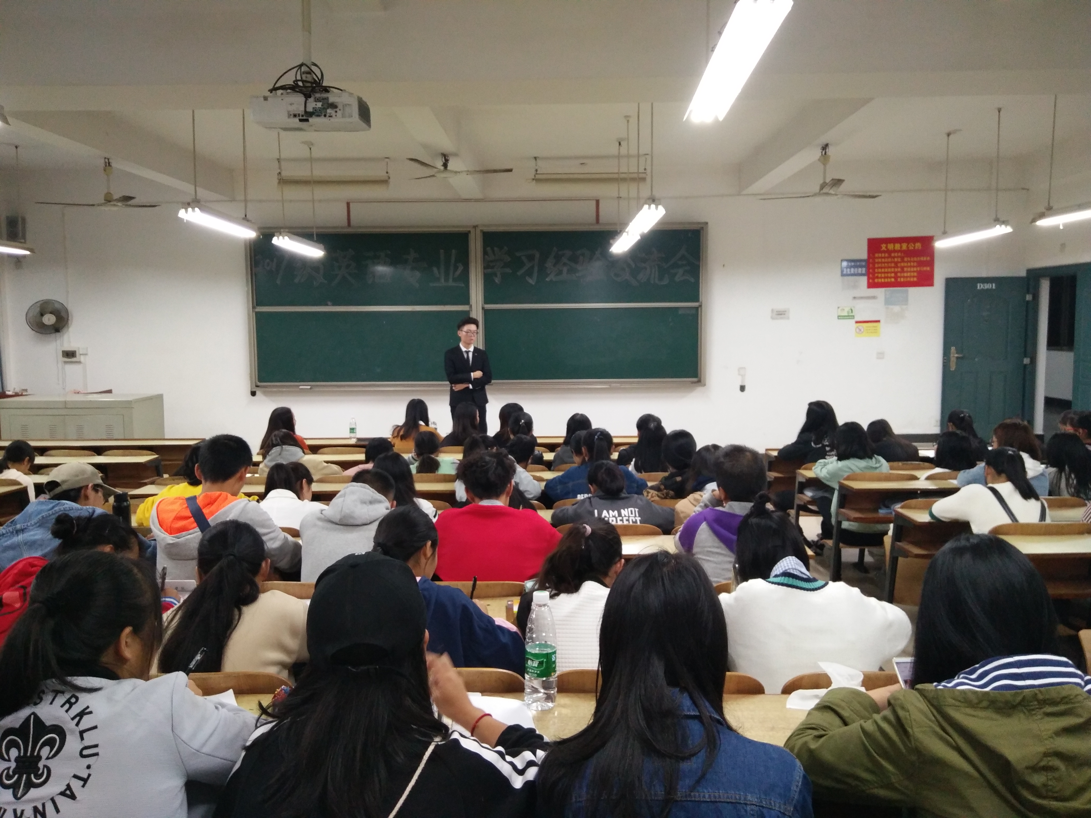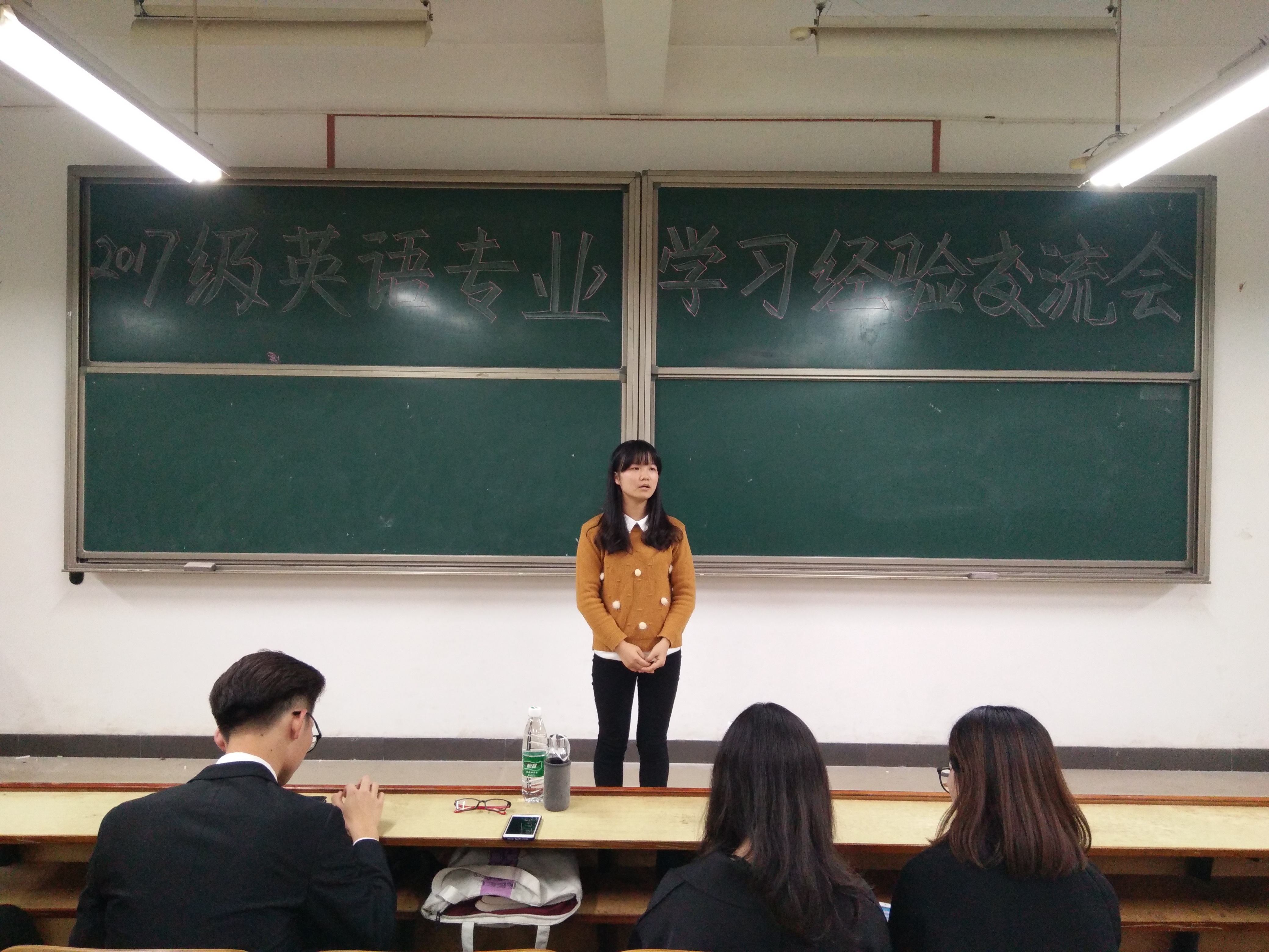 为了使英语专业新生更快、更好的完成由高中生到大学生角色的转变,迅速的融入到大学生活中,388vip太阳集团官网于10月23日晚7::00在教学楼D301举行了2017年度英语专业学习经验交流会。本次学习经验交流会由388vip太阳集团官网团学会干部刘恬文、何李佳主持,388vip太阳集团官网2017级全体英语专业学生到场聆听。388vip太阳集团官网2017-2018届校团委秘书长徐佳琦、388vip太阳集团官网英语专业优秀学生代表李明丽、388vip太阳集团官网2016-2017届团学会主席叶金菊作为特邀嘉宾参加了本次学习经验交流会。