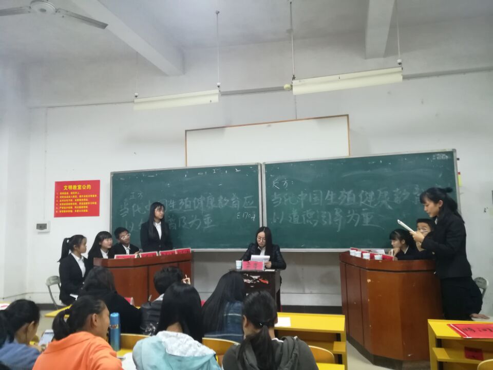 此次辩论赛由英语1704班对辩英语1702班,商英1703班对辩英语1701班。正方支持知识普及,反方支持道德引导。首先是开篇立论环节,正方简明扼要地从知识普及有利于改善生殖健康简洁严明的阐述了健康生殖教育应以知识普及的观点,反方则从道德引导能有效预防不良性行为来阐述自己的观点。接着是自由辩论环节,双方选手互不相让,争锋相对,就辩题方面展开了更深层次的较量。正方从三个方面进行论述。第一,在生殖健康方面,要立足现状,更需要知识普及。第二要知而后行,即知识作为生殖教育教育的基础。第三,知识普及更可能促进社会和谐发展。反方也同样从三个方面进行了反驳,第一道德教育是生而有之。第二,道德教育更能实现社会普及。第三,道德教育能营造好的社会风气。随着时间推移,辩论环节的推进,比赛逐渐激烈起来,不时地赢得台下观众的掌声与欢呼声。互动环节中,现场观众还与辩手就艾滋病预防等相关问题进行了探讨。整场比赛高潮迭起,热烈非凡。最后,评委对本次辩论赛做了精彩的点评,肯定了双方辩手的努力,也指出了不足之处。经过激烈的角逐,英语1704班和商英1703班获得了胜利,同时英语1702班罗海珊和英语1701班唐小斐凭借优秀的表现摘得最佳辩手的称号。