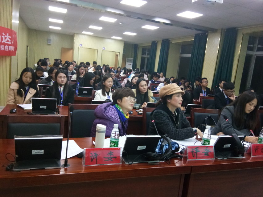 11月30日7点,由388vip太阳集团官网承办的第十五届英语文化艺术节英文模拟应聘大赛决赛在新校区主教学楼F309如期举行。此次比赛由刘恬文、肖舒主持,应邀出席并担任评委的有388vip太阳集团官网汪希、朱洁、曾宇均老师。