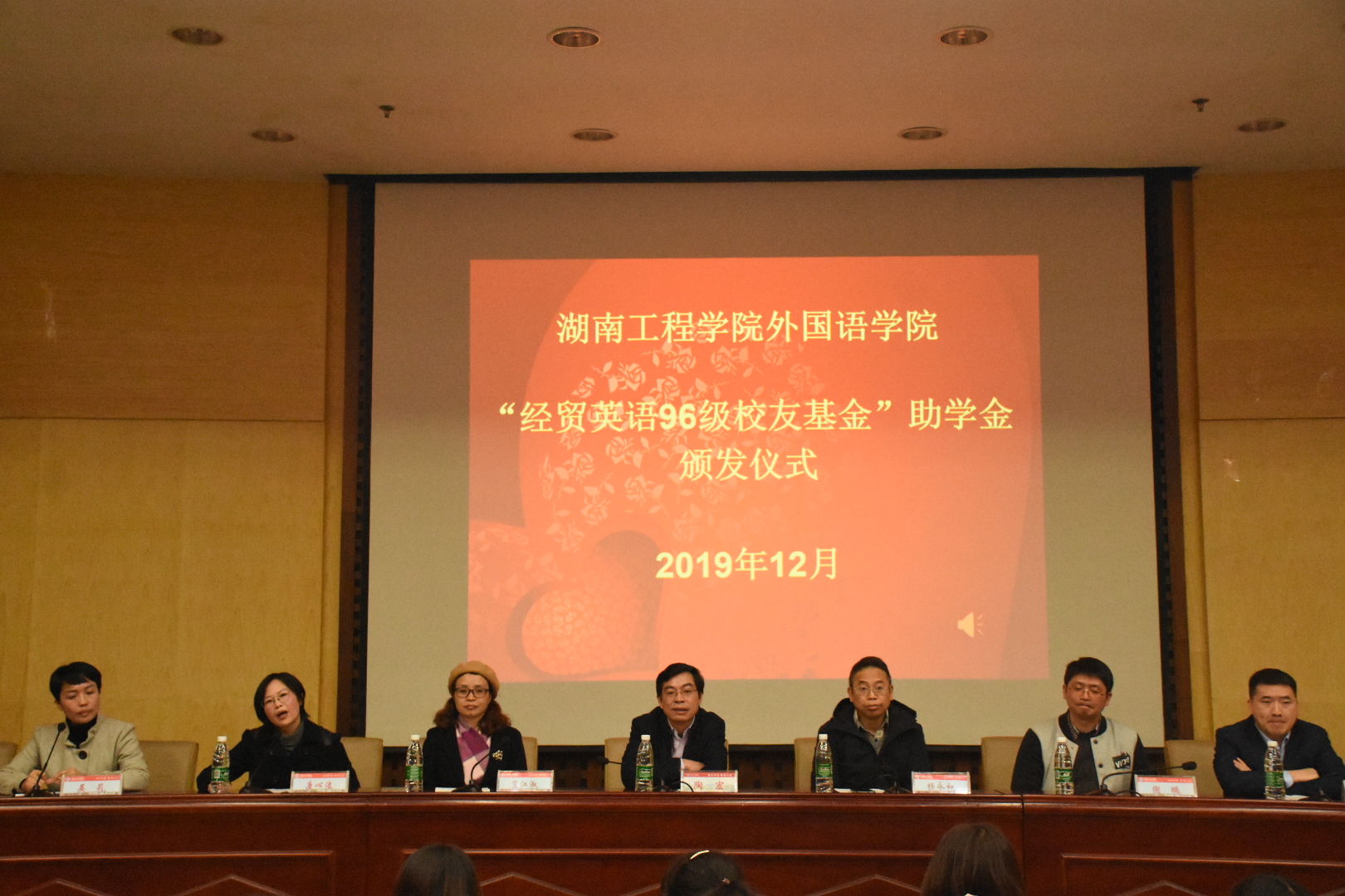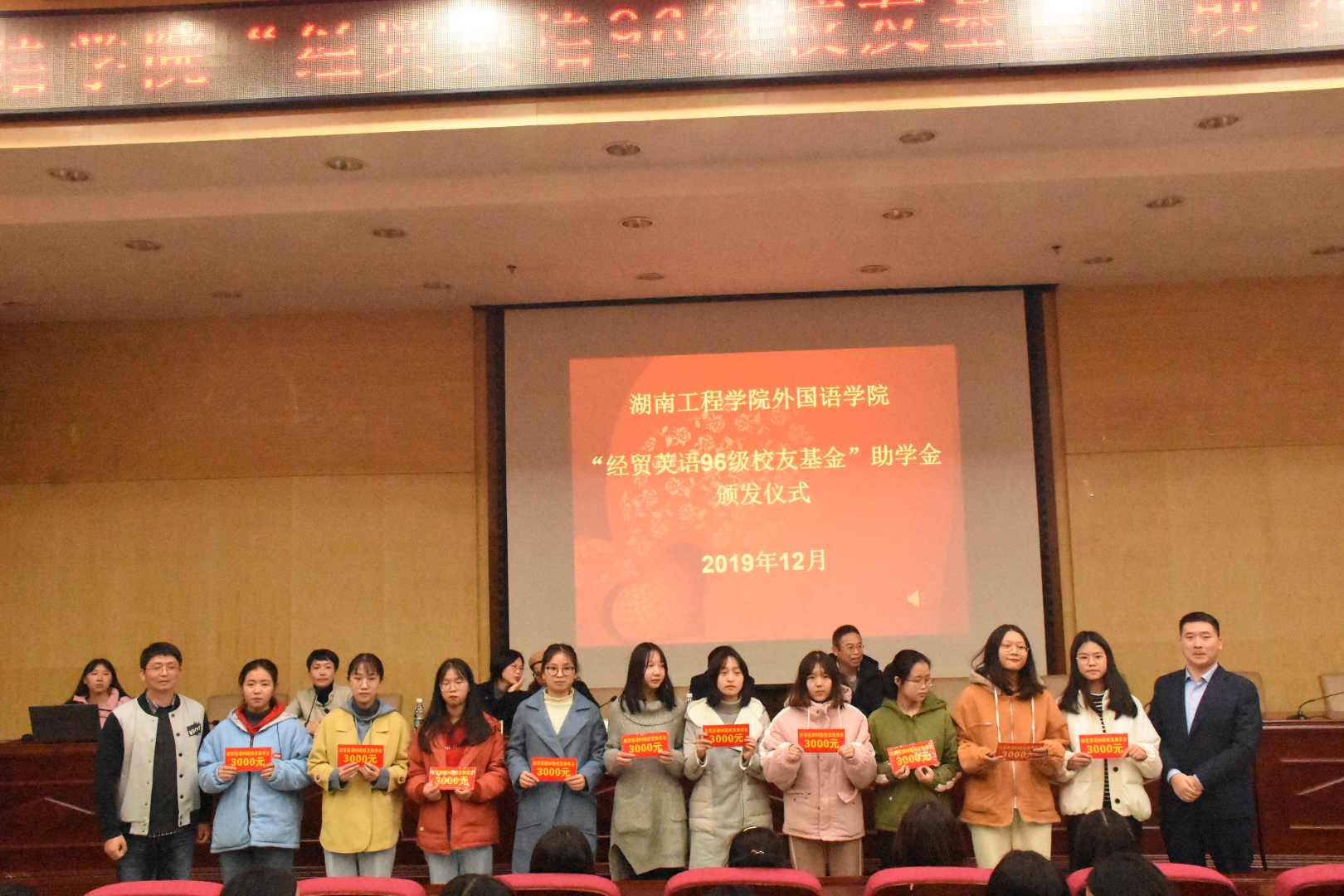 12月5日19:00,388vip太阳集团官网于二报告厅举办了经贸英语96级校友助学金颁发仪式。校友办主任陶宏,388vip太阳集团官网院长杨永和、党总支书记肖江淑、经贸英语96级班主任唐心洁、96级校友代表张科林、谢鹏和学院学生代表参加了本次仪式,仪式由学院学生工办公室主任晏莉主持。