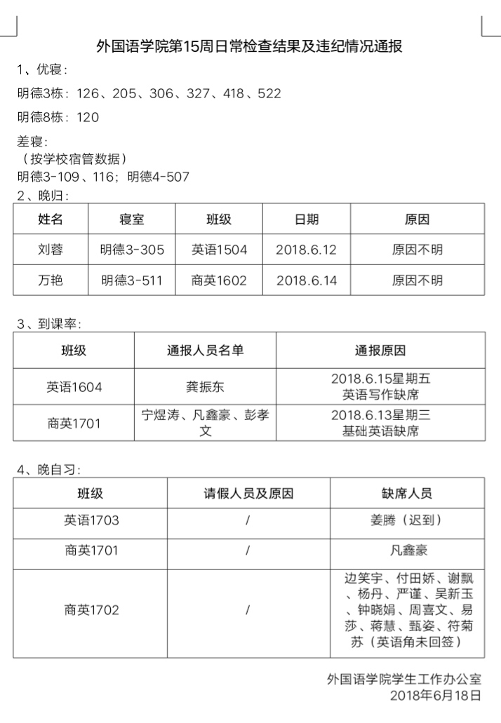 388vip太阳集团官网第15周日常检查结果及违纪情况通报