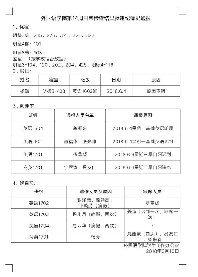 388vip太阳集团官网第14周日常检查结果及违纪情况通报