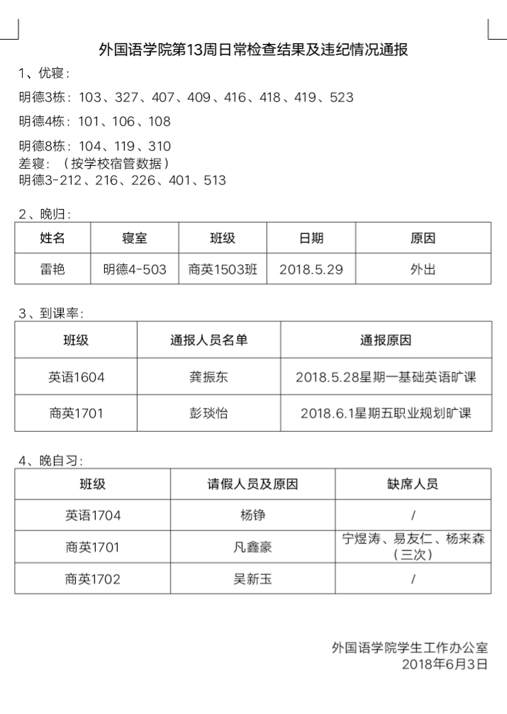 388vip太阳集团官网第13周日常检查结果及违纪情况通报