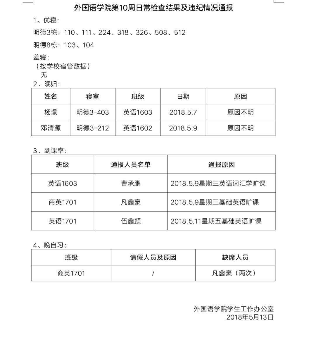 388vip太阳集团官网第10周日常检查结果及违纪情况通报