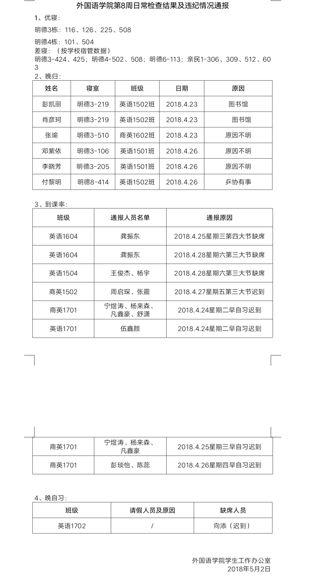 388vip太阳集团官网第8周日常检查结果及违纪情况通报
