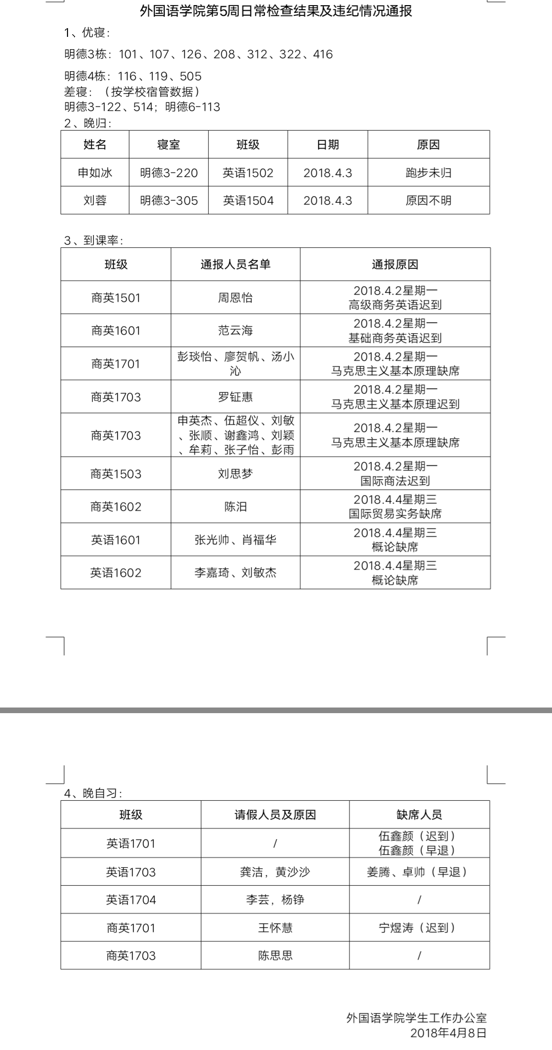 388vip太阳集团官网第5周日常检查结果及违纪情况通报