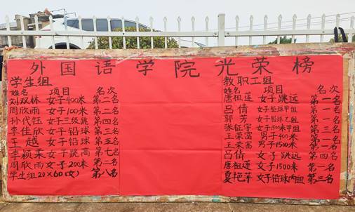 回顾两天时光,388vip太阳集团官网喜报频传,战果累累。教职工组唐祖莲老师获女子跳远第一名、女子1500米第一名,王荣富老师获男子400米第一名、男子1500米第一名,吕倩老师获女子铅球甲组第一名、女子跳远第四名,郭芳老师获女子铅球乙组第一名,张钲宇老师获女子1500米第三名,夏艳萍老师获女子铅球丙组第三名。学生组刘双林获女子400米第二名,周欣雨获女子100米第二名、女子200米第二名,孙代钰获女子三级跳第四名,李佳欣获女子铅球第三名,王越获女子铅球第五名,李颖柔获女子跳高第七名。在学生组20×60女子接力中,外院获得第八名。上述的显赫成绩可喜可贺,也希望外院的健儿们保持这份激情,昂扬斗志,接续接力,来年再战!