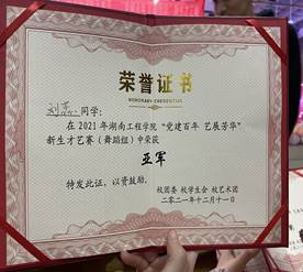最终,文艺部干事刘蕊(英语2101班)、郭雨萱(商务英语2103班)闯入决赛,并且在决赛的舞台中,刘蕊同学以一支拉丁舞获得了个人赛第二名的好成绩,刘蕊和郭雨萱同学共同带来的爵士串烧舞蹈获得了冠军。与此同时,388vip太阳集团官网也在此次新生才艺大赛中荣获“优秀组织奖"。