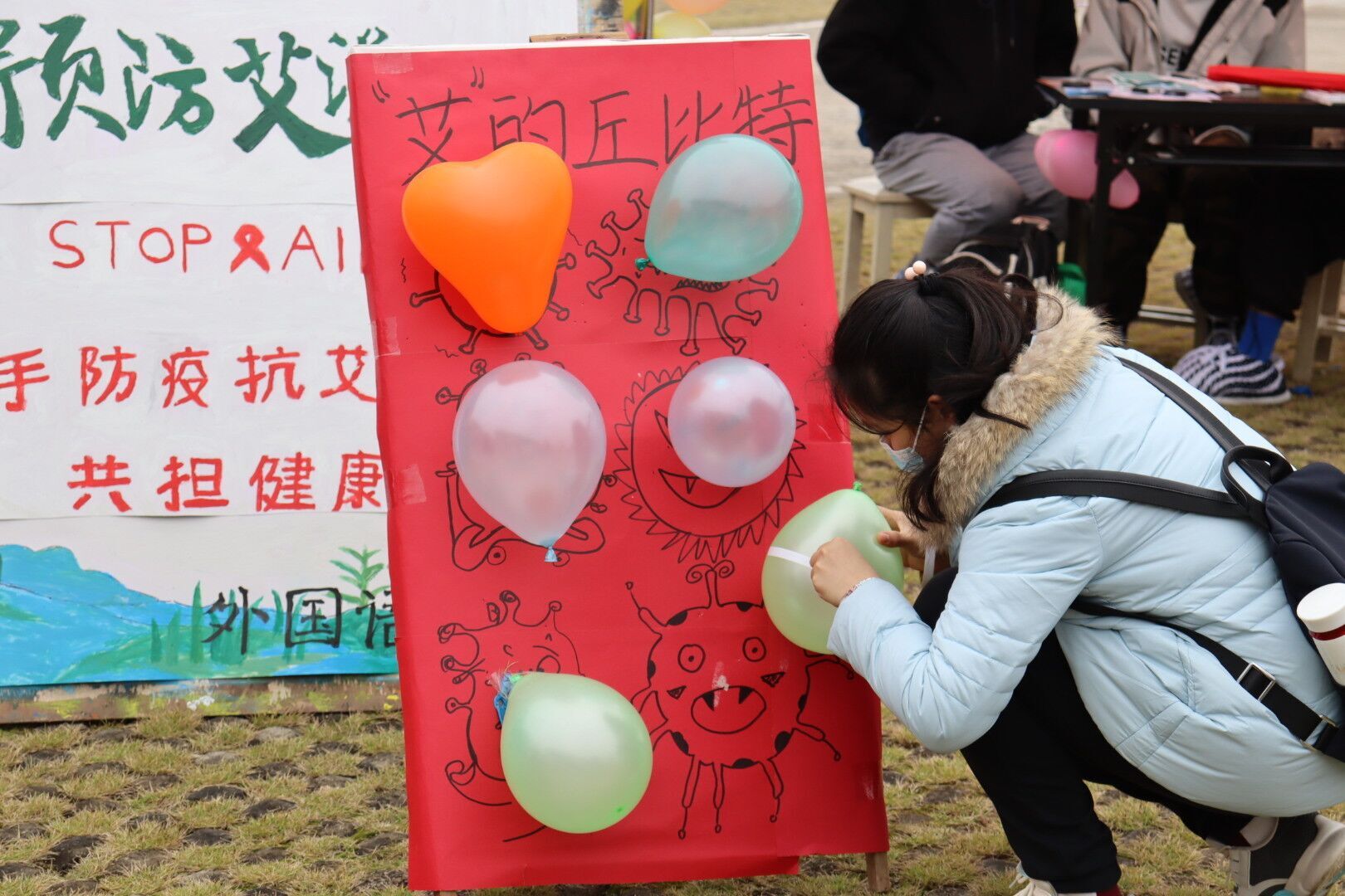 活动过程中,志愿者代表领头宣誓。志愿者们纷纷举起右拳,郑重宣誓,展现了投身于防艾抗疫工作的坚定决心。来自388vip太阳集团官网的任欢同学作为志愿者代表进行发言。她表示,在全球抗疫的大背景下,爱心才是防艾的最佳武器。希望大家能够关注艾滋,共同行动,点亮心灵的火把,用爱心温暖艾滋病人。言毕,学校领导带领所有参与者在签名墙上签名,许下了防艾抗疫的诺言。全体志愿者合唱《让世界充满爱》,歌声温暖而又悠扬,随着江风吹进了在场每一个人的心里。各学院精心策划的防疫抗艾小游戏也精彩纷呈,388vip太阳集团官网组织发起的绑腿过病毒、飞镖射病毒的小游戏吸引了众多同学前来参与,同学们各显本领将精美礼品收入囊中。同学们纷纷表示,游戏很有趣,在参与过程中也对艾滋病有了更深的了解。在体育馆前坪,388vip太阳集团官网打卡点前排起了长队,可见同学们参与活动的热情和本次活动策划的成功。既实现了在欢笑中学习防艾抗疫知识,又真正做到了行之有效的教育宣传。