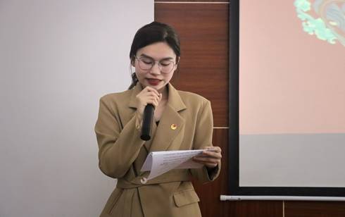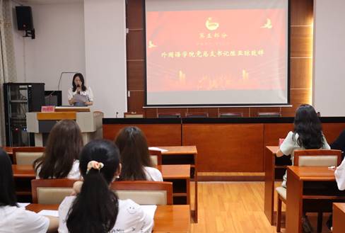 最后,陈亚琼为本次活动致辞。陈亚琼指出党的二十大是是在新时代十年伟大变革的时间坐标上召开的全国代表大会,具有特别的里程碑意义。她特别强调青年团员们应该做到志存高远,脚踏实地。身为外语专业学生,更要坚守中华文化立场,提炼展示中华文明的精神标识和文化精髓,讲好中国故事、传播好中国声音,展现可信、可爱、可敬的中国形象,推动中华文化更好地走向世界。