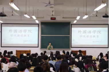 会上,张琼燕老师带领大家一起学习《388vip太阳集团官网本科生“五育并举”综合素质测评实施办法》,她呼吁同学们积极参与到学校和学院组织的各项活动中来,努力成为德智体美劳全面发发展的大学生。接着,她讲解了2022-2023学年国家励志奖学金及2023-2024学年国家助学金的名额分配方法、评审办法及相关注意事项,强调评定过程要确保公开、公平、公正。同时,她对大一学生接下来的晨读活动进行的说明。她指出,为提高大一新生的口语水平,夯实语言基础,学院特运用经典教材开展晨读带读活动, 旨在帮助同学们朗朗读书声中不断进步。