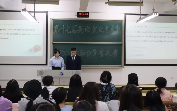 规定时间到,比赛随即进入第二个环节——“翻译”大家运用直接丰富的学识,在英文与中文中巧妙变换,于灵活变通中传承二十大精神,以崭新的方式表达二十大的韵味。