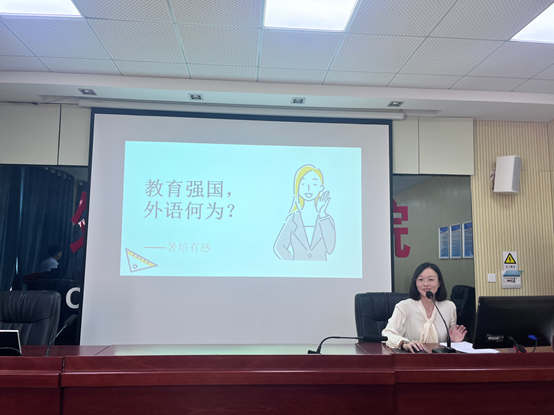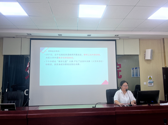 首先由3位老师分享暑期培训的心得体会。商务英语系陈水英博士以《教育强国,外语何为?》为题、公共外语一部副主任杨源老师以《以育人之思、依技术之智,推动大学外语教学改革与创新》为题、公共外语二部胡玢老师围绕课程思政为主题进行了分享。