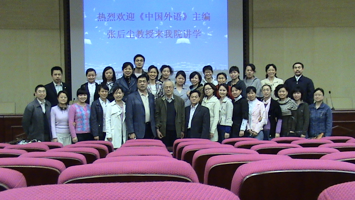 下午,张后尘教授给全院师生做了一场充满了精彩的学术讲座。学术讲座的题目为《学术研究中的几个问题》,主要内容如下:一、 准备是学术研究的基础:学术准备包括哲学准备、数学准备、多学科知识的准备、定向准备、跨学科研究的思想准备;二、 创新是科研发展的动力;三、 开疆是科研工作的目标。张后尘教授还结合实际情况,介绍了《中国外语》杂志的学术思想和用稿原则,鼓励青年教师勇于探索、勤奋创新,希望看到388vip太阳集团官网388vip太阳集团官网更多的学术成果。讲座旁征博引、例证丰富、生动有趣,对388vip太阳集团官网师生来说是一次难得的学术洗礼。学术讲座结束后,张后尘教授与388vip太阳集团官网的教师集体合影。