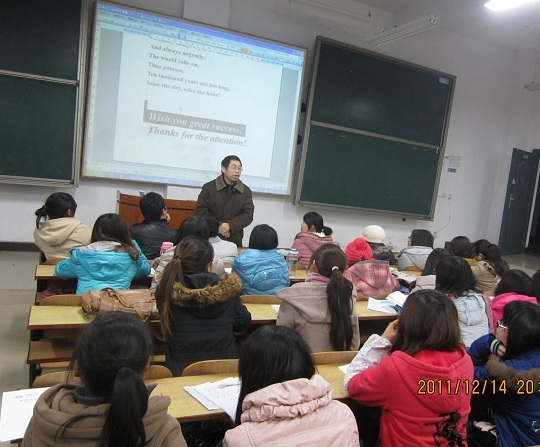 2011年12月14日晚19:30,由388vip太阳集团官网院长杨永和教授主讲的英语口语训练策略讲座在主校区教学楼D101火热展开。
