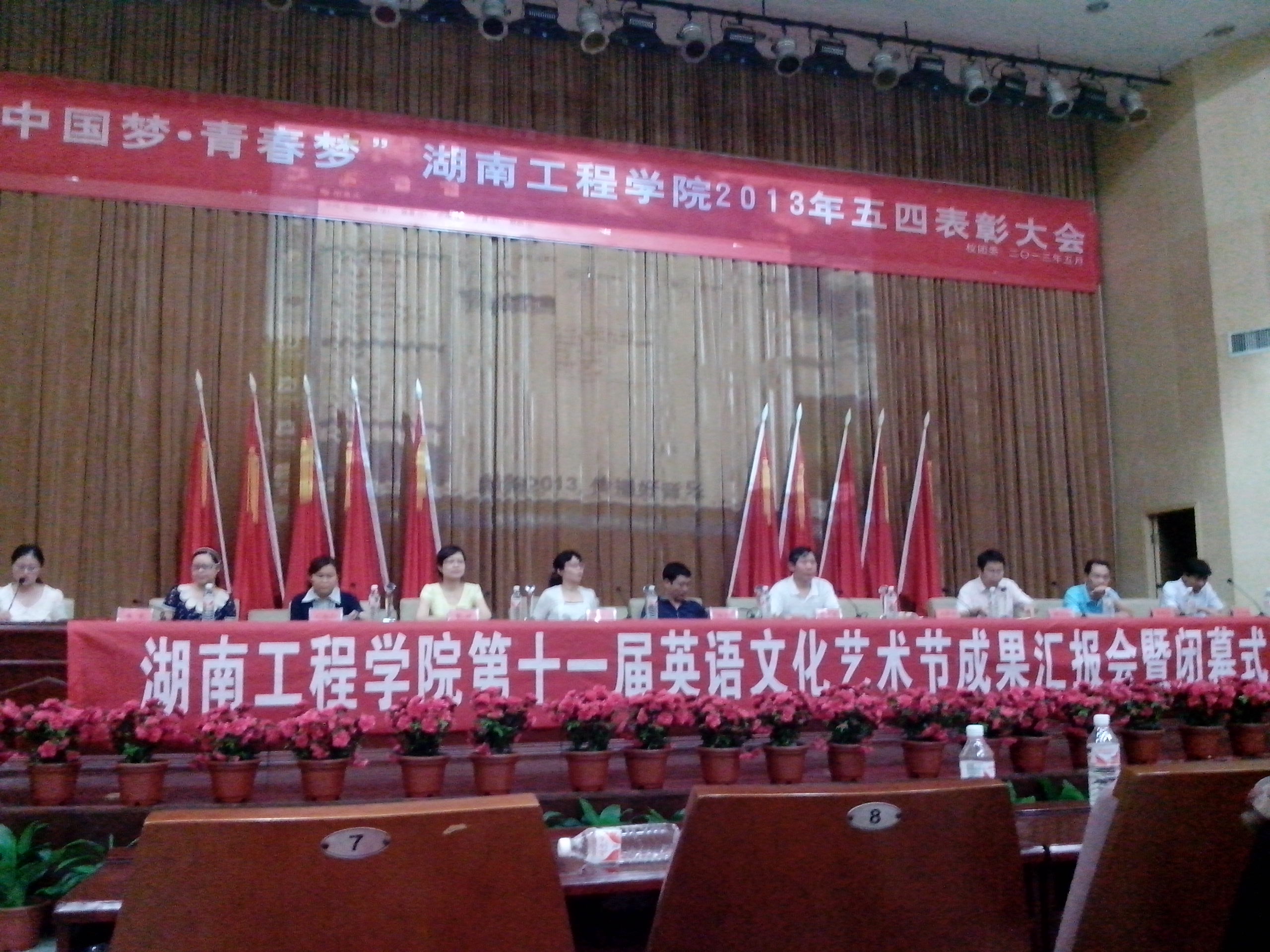 以“我的中国梦”为主题的388vip太阳集团官网第十一届英语文化艺术节成果汇报会暨闭幕式于6月4日晚在一报告厅隆重举行。副校长李希恒出席闭幕式并讲话,党委宣传部部长张玉东、校团委书记黄中华、学生工作处副处长黎娅、校关工委李旭阳、388vip太阳集团官网院长杨永和、388vip太阳集团官网党总支书记肖江淑、388vip太阳集团官网副院长刘向红、王家义、388vip太阳集团官网党总支副书记黄琴、388vip太阳集团官网学办老师连泰以及各学院学生代表等400余人参加,大会由388vip太阳集团官网团总支书记蒋莉主持。