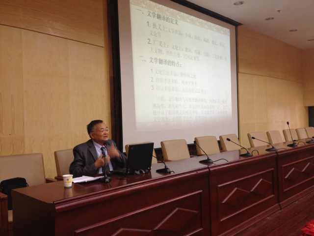 杨仁敬教授不顾长途跋涉的劳累,作了近两小时的题为《文学翻译与文学流派》的学术报告。杨教授结合自己的学术经历和翻译实践,侃侃而谈,从六个方面纵论文学与翻译。他首先指出文学翻译的特点,接着从文学翻译与其他类型翻译的比较、文学翻译与文学流派和学科的关系、文学翻译的方法和文学翻译的困难等方面展开论述,从而把文学与翻译两门学科有机地结合了起来。杨教授提出深厚的汉语功底是做好翻译的前提,并且给出了具体的建议,即通过阅读散文来提高汉语功底,杨教授指出老舍的《骆驼祥子》和冰心的散文集都是很好的阅读材料。