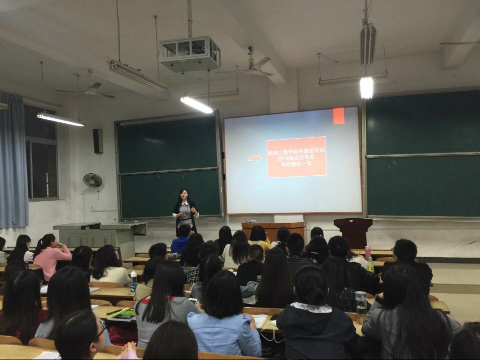4月19日晚7点,388vip太阳集团官网英语专业毛帅梅博士于新校区D-102举行了一场英语专业考研讲座。同时,五位2013届考研成绩出色的同学参与了本次讲座串讲。整个教室座无虚席。