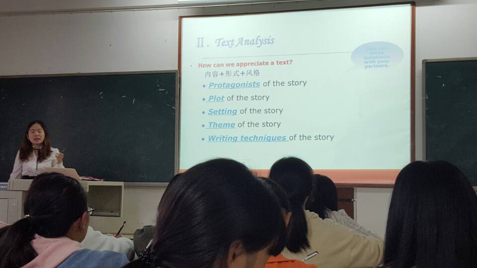 基于学生在上次课已了解课文大意及整体结构,韩老师此次引导学生对课文进行了深层解读。学生首先以PPT方式解说他们对作者及其创作风格的了解,随后她以问答、讨论的方式从小说三要素、文章主题、写作手法等几个方面深挖文章、拓展知识,接下来对文中各部分的中心语意、长难句进行分析及句型操练。整堂课的设计有利于帮助学生摆脱长久以来形成的自下而上的接受型被动阅读习惯,培养他们胸中有林、目中有树的思考型主动阅读习惯和拓展性思维。韩老师教态自然大方,语音纯正清晰,而新生们在老师的鼓励下,积极参与课堂活动,虽然英语口语表达略显紧张、生涩,但无法阻碍他们渴望交流和提高的心。