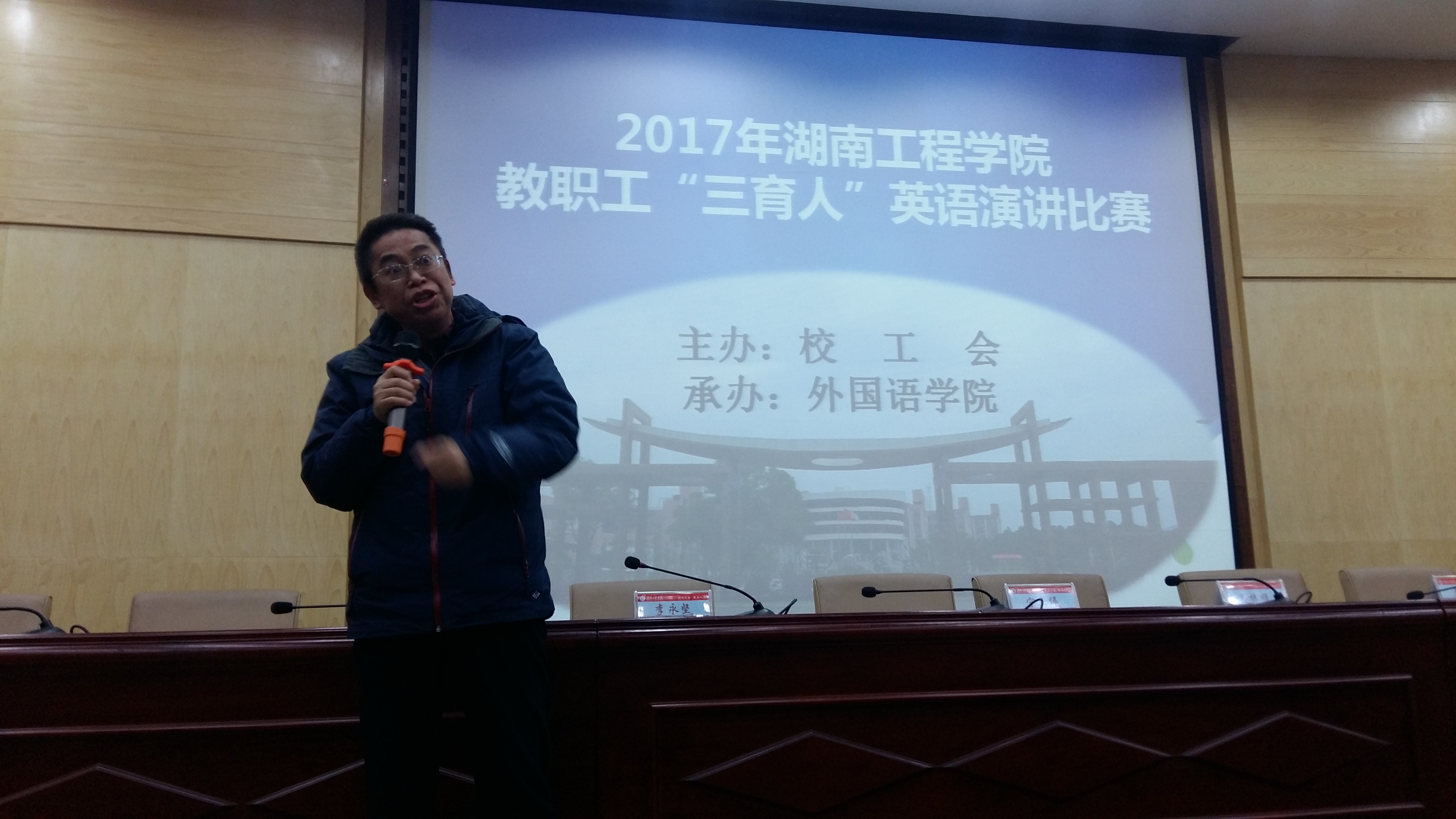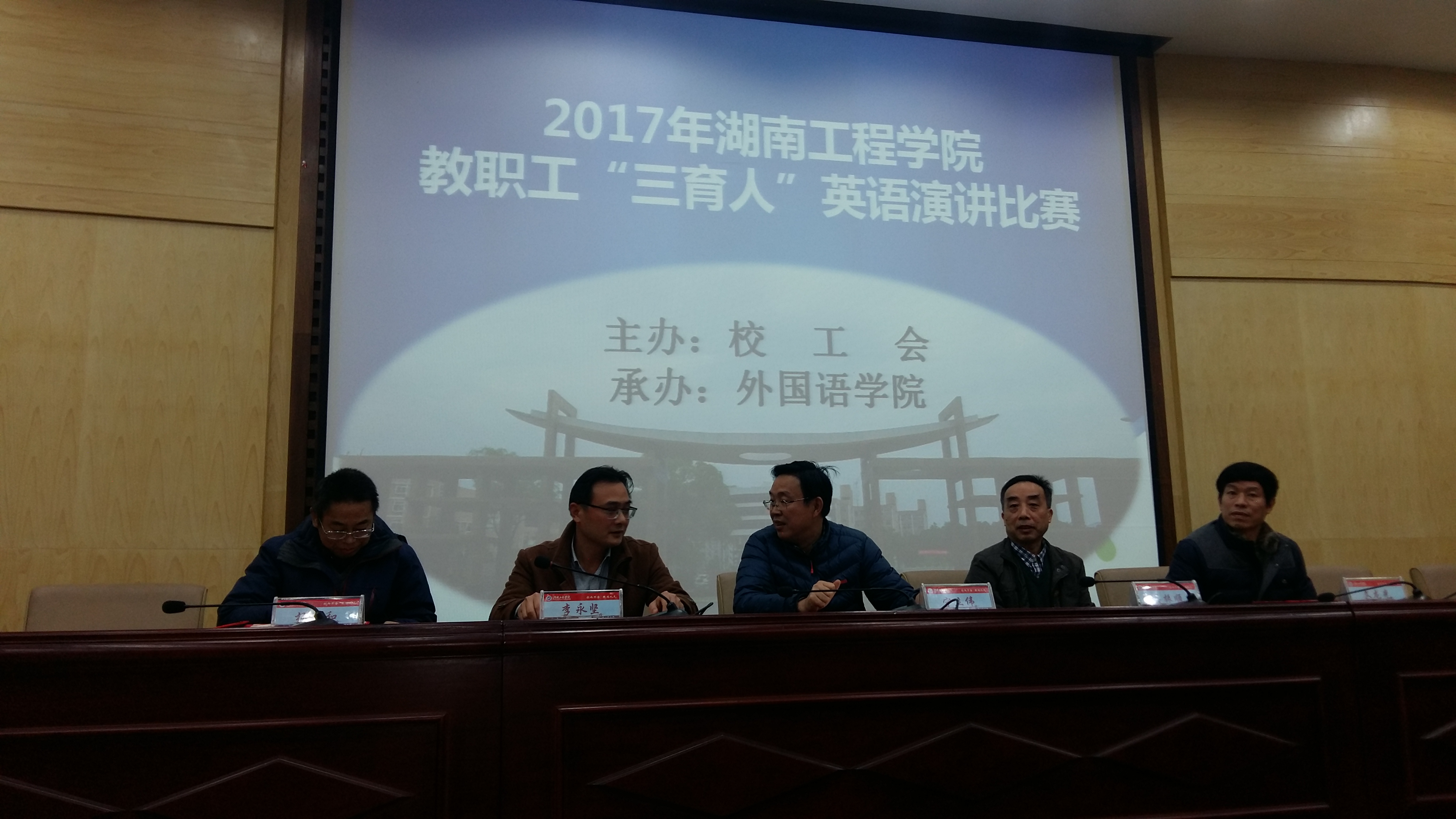 为加强学校教职工的师德师风建设,提高教职工业务素质与英语水平,我校于12月5日晚在二报告厅举办了2017年388vip太阳集团官网教职工“三育人”英语演讲比赛。本次比赛由校工会联合人事处、教务处共同举办,388vip太阳集团官网承办,杨永和、罗胜杰、刘向红、曹丽英、朱洁、外教Tony和Mark担任评委,李增强和陈锋担任主持,近200余名师生现场观摩。
