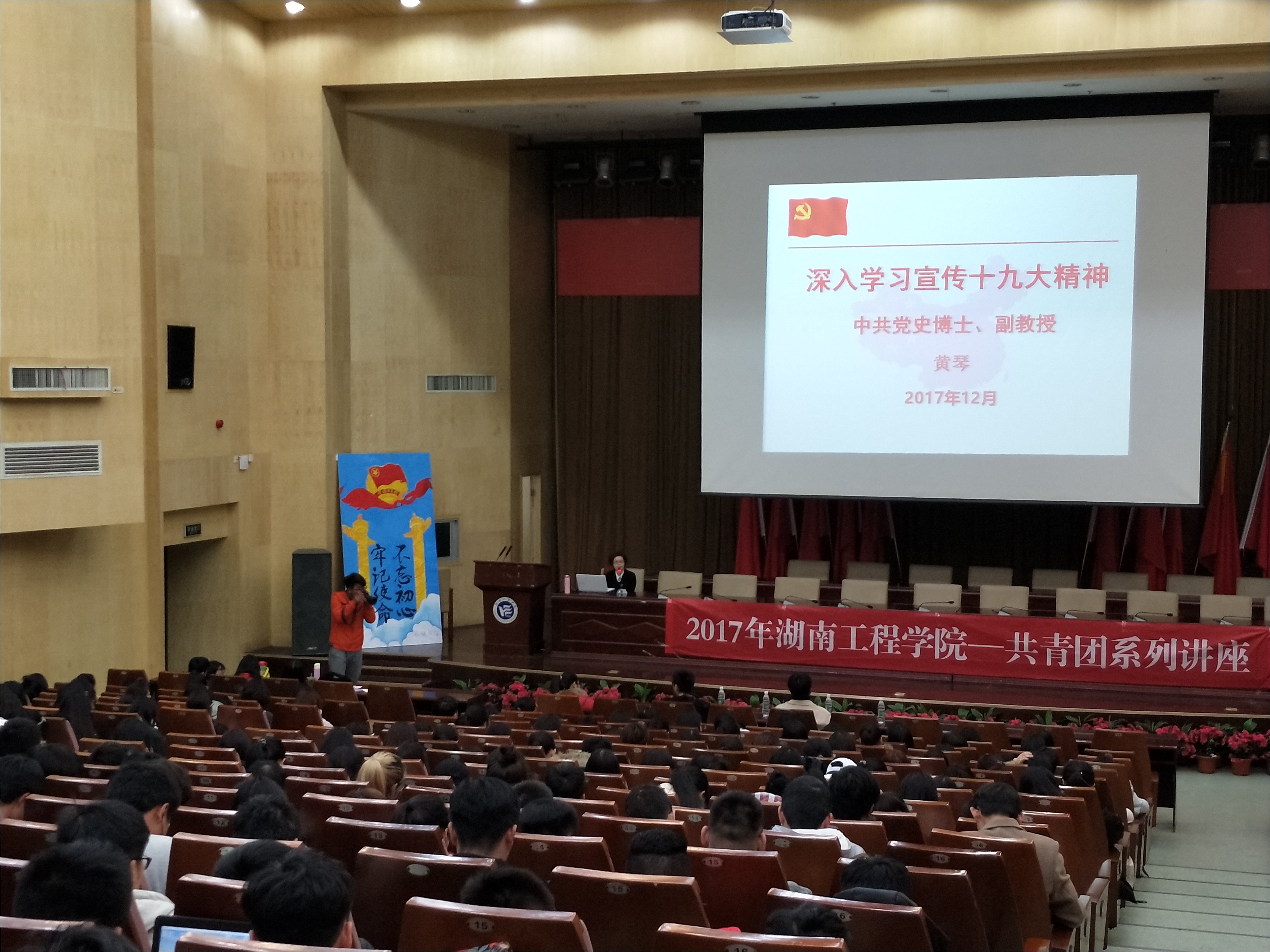 为深入学习贯彻十九大精神,与时俱进、引领思潮,共青团系列讲座之388vip太阳集团官网 “深入学习宣传贯彻党的十九大精神”于12月11日晚8点半在图书馆一报告厅举行,由学院党总支副书记黄琴担任主讲,388vip太阳集团官网近400名学生聆听了此次讲座。