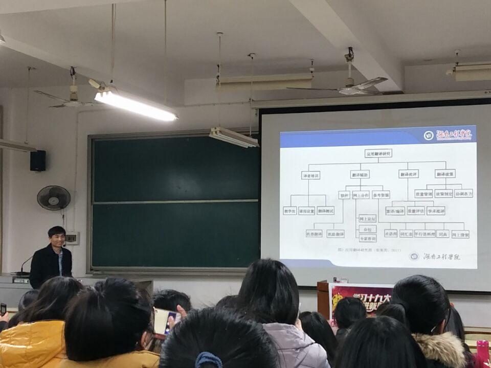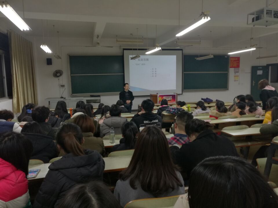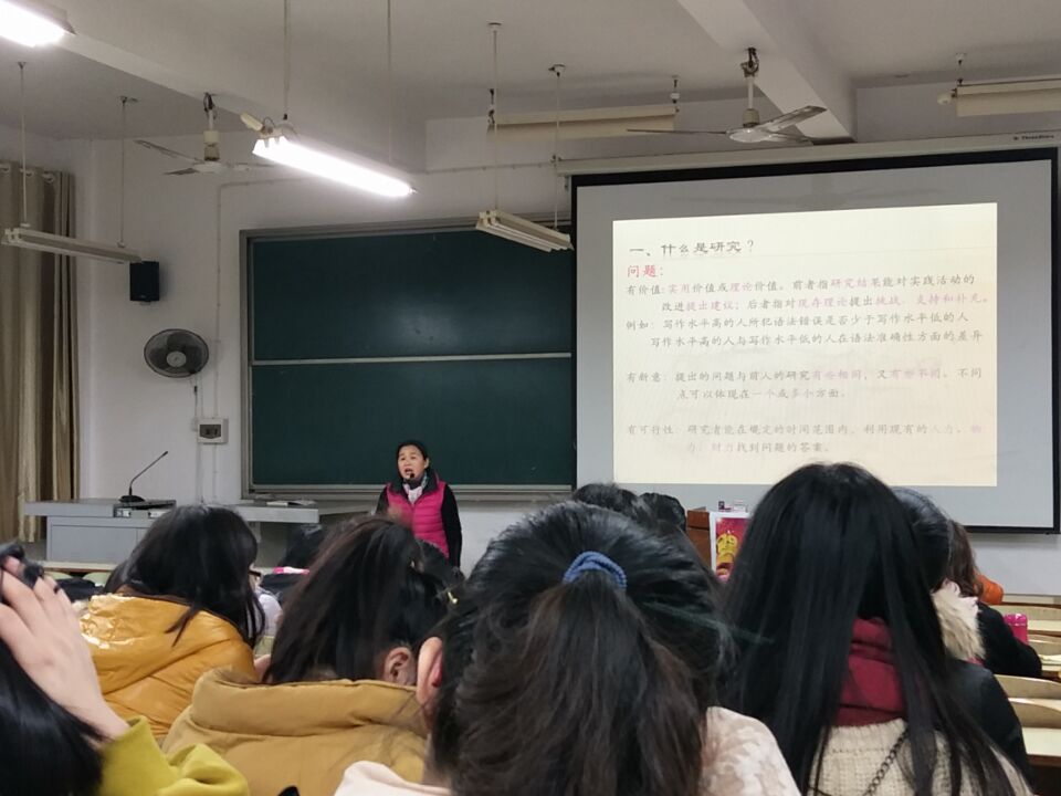 为切实做好2018届英语专业学生毕业论文工作,12月26日晚,388vip太阳集团官网英语教研室邀请了罗胜杰副院长、王家义副院长、刘向红教授和彭禹博士分别就语言文化、翻译、英语教学和英美文学四个方向的毕业论文选题与研究方法进行了专题讲座。教研室朱洁、章明蕾、唐心洁、毛帅梅、刘肯红、周旭阳等老师与英语专业14级全体同学在D-502一起聆听。
