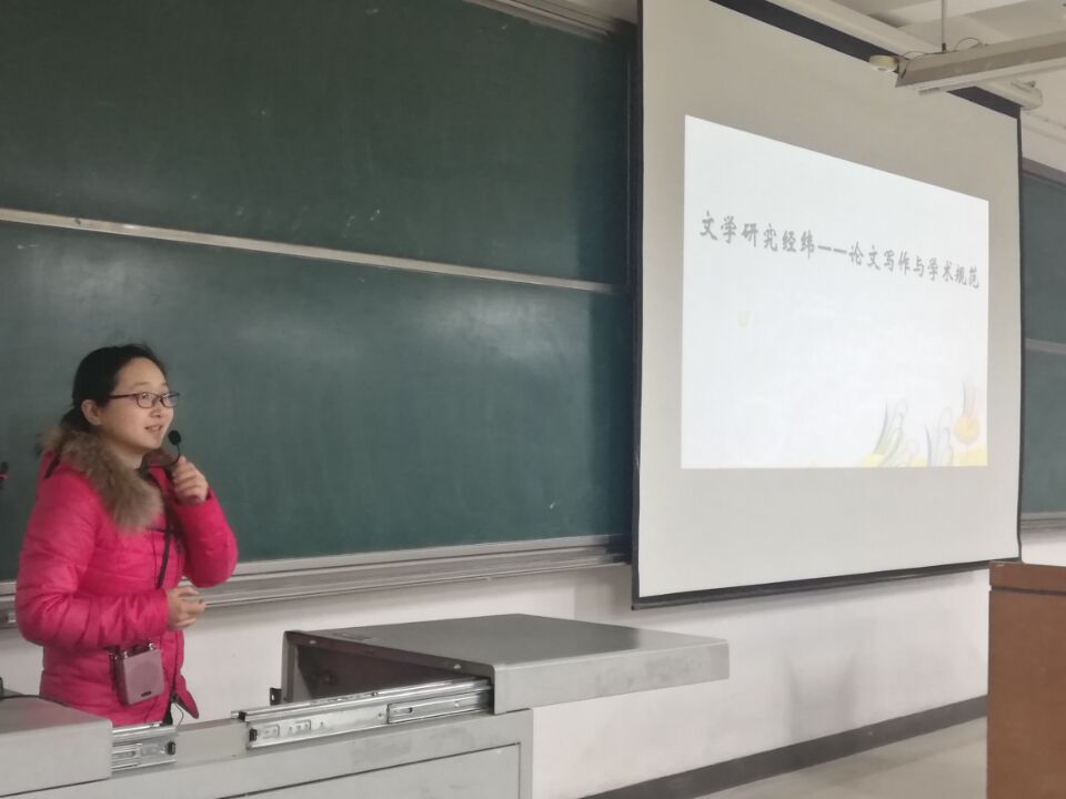 罗胜杰指导学生如何做好撰写毕业论文的必要准备:根据“所学、所能、所有、所好”来拟定范围;广泛涉猎,“站在别人的肩膀上”收集资料;在导师的引导下,根据自己的研究兴趣和能力拟定选题;理顺思路,拟定提纲。他的发言层次清晰,以生动幽默的语言向学生们展示了语言文化研究的魅力。刘向红围绕“什么是研究”和“研究什么”,从理论与实践两个侧面介绍了英语教学研究的选题、论文设计以及研究方法。她以严谨的治学态度、扎实的理论素养和细致的实例分析,引领同学们走进英语教学研究之门,让学生豁然开朗。王家义在翻译学整体架构的理论背景之下,运用Citespace软件形象地演示了当今外语界翻译学领域热点研究的分布情况,并通过一系列具体的选题案例,分析比较了各类选题的可行性。讲座中与同学们积极互动,充分调动了学生的兴趣和参与度。彭禹博士探讨了学术论文写作的五个关键环节以及学术规范问题,以今年诺贝尔文学奖得主石黑一雄为例,一一剖析了文学研究的作者、作品、研究视角的选取,拉近了同学们与文学巨匠的距离,增强了学生的研究信心。讲座娓娓道来,如春风拂面般为同学们送来文学的清风。