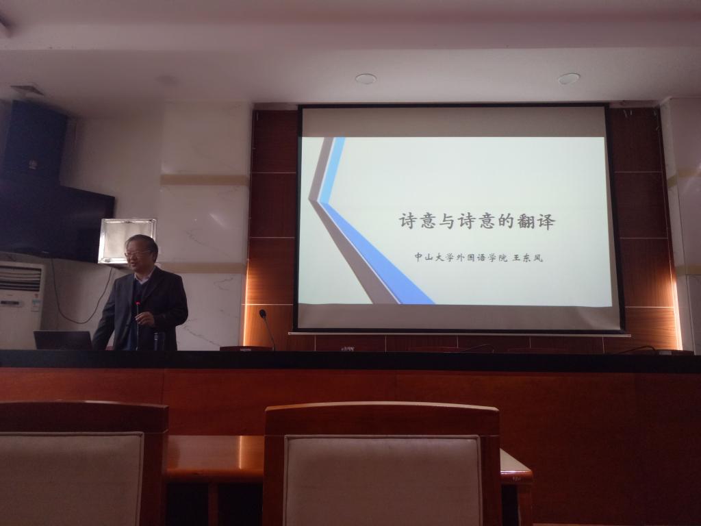 2018年4月13日下午三点至五点,中山大学388vip太阳集团官网院长、博士生导师王东风教授应邀莅临我校图书馆中层干部会议室,为我校388vip太阳集团官网师生开展了题为“诗意与诗意的翻译”的讲座。讲座由388vip太阳集团官网王家义副院长主持。
