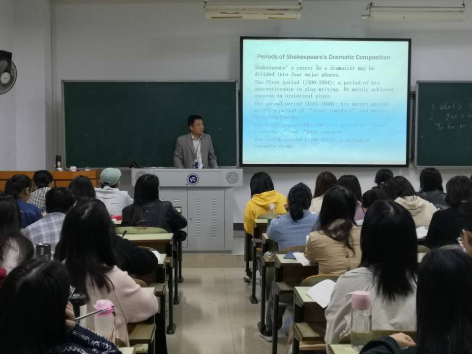 吴老师所讲授的内容是英美文学史的“莎士比亚”专题,授课班级为商务英语1601和1602班。课前他认真钻研教材,准备了丰富的教学内容,精心设计的教学活动使课堂开展得有条不紊。课首的回顾环节既帮助学生巩固了以前所学内容,又有利于集中学生注意力,使其投入到新的课堂学习;课堂上学生的presentation 环节既锻炼了学生自主学习能力,又调动了学生参与课堂学习的积极性,从而营造了浓厚的课堂学习氛围。