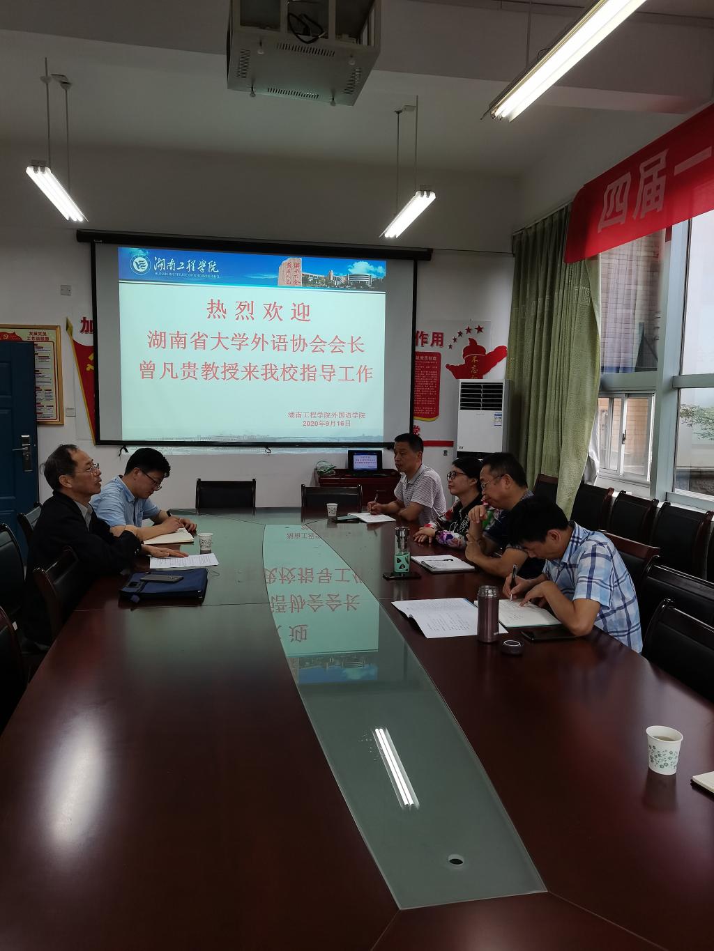 2020年湖南省大学生英语演讲比赛将于10月下旬在我校举行,为确保此次大赛的圆满举办,湖南省大学外语专业委员会会长曾凡贵教授于2020年9月16日上午专程来到我校,就英语演讲比赛作主旨报告,并对省级学科竞赛相关工作进行指导。我校副校长李军林教授与曾凡贵教授进行了亲切友好的会谈,创新创业学院院长刘洞波教授和388vip太阳集团官网领导班子成员参与会议。