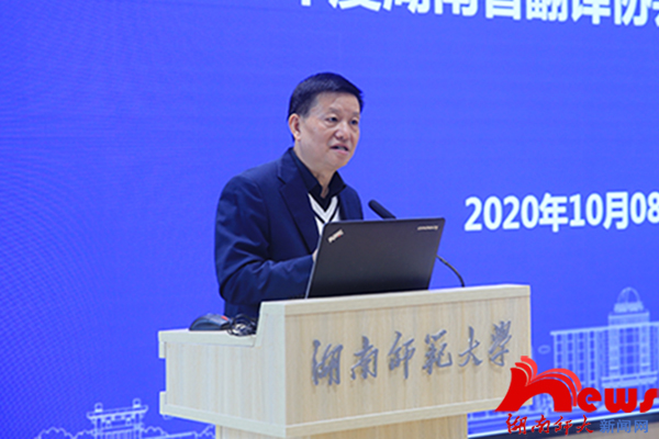 蒋洪新代表学校对各位成员的到来表示欢迎和感谢。他回忆了翻译协会创建的艰辛历程,并指出,大学就是一群具有共同理想的人聚集在一起而形成的共同体,共同体的意义不仅仅是促进大学的发展,也促进我们自身的发展。湖南省翻译协会的建立对学术的发展、对湖南外语教育事业的发展都是有着举足轻重的意义。他从湖南师范大学一流学科建设和发展的具体情况为切入点,对协会未来的建设提出希望:一是组织建设要更加健全,人员分工要更加具体;二是协会要以学术建设为主,努力走出湖南省的特色,进一步和国际打通联络;三是构建和谐、团结、奋进的团队氛围,积极鼓励和扶持青年一代“外语人“。他寄语与会人员可以同心同德、互相帮助,共同推进湖南省教育事业的发展,争取为国家、为社会、为人民做出更多有益的贡献。