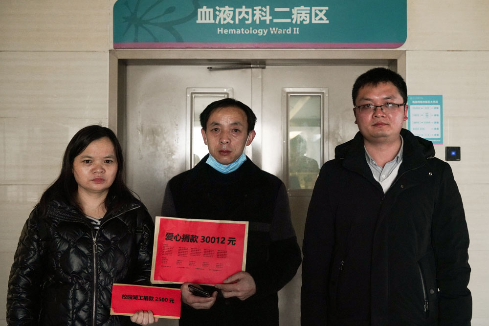 3月12日下午,党总支书记肖江淑带领学生办公室辅导员晏莉、彭虹、班主任梁彪、教师代表苏静等人前往湘雅医院进行探望,他们将前期除水滴筹、微信转账以外筹到的现金捐款32512元交到容珍父母手中。