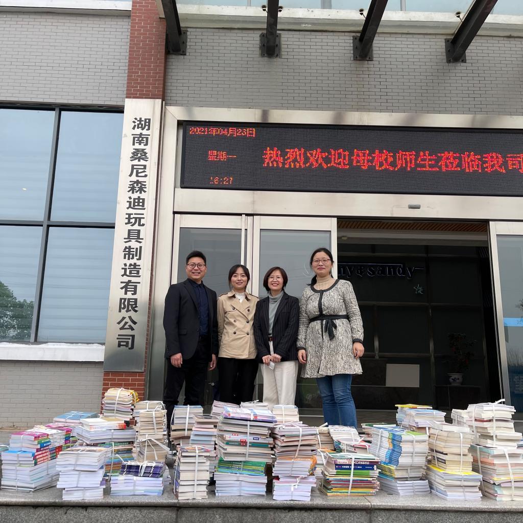 我校经贸英语03级校友,现任湖南桑尼森迪玩具制造有限公司董事长及进出口业务部部长许凌云热情地接待了英语专业实习的师生。交流内容包括工厂参观和校企合作等方面。 首先,许凌云部长向同学们介绍了桑尼森迪的发展历程,目前该公司处于鼎盛时期,现有员工600多人,总计划投资8000万,仅2018年就创汇2500万美元,为加快湘潭市经济社会协调发展作出了卓越贡献。然后,许部长带领同学们参观了玩具样品和生产车间,参观过程中,许凌云就企业文化、对外贸易及技术产品等方面做了现场讲解,并向同学们介绍了完整的生产制作销售流程,书上得来终觉浅、绝知此事要躬行,同学们纷纷表示受益匪浅。大家被样品柜中展出的琳琅满目、精湛绝伦的玩具产品深深吸引;同时,也对公司通过长期努力获得的各种国际质量证书、资质证书大为赞叹。参观结束后,校企双方就校企合作、基地建设、专业实习等细节问题进行了交流与沟通。杨永和感谢校友的大力支持与悉心指导,代表学院向桑尼森迪捐赠图书资料1000本,助力公司建设图书资料室,提高员工的学习积极性与知识水平。