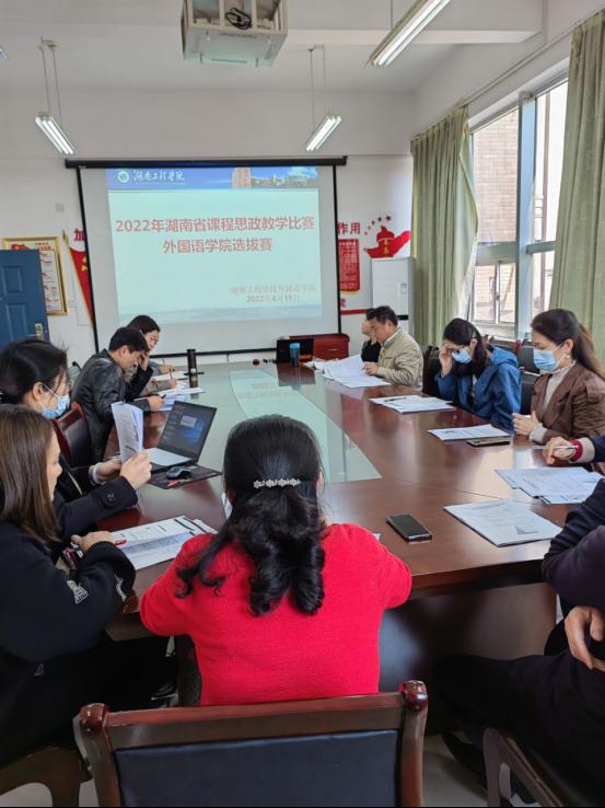 4月19日下午, 2022年湖南省课程思政教学比赛388vip太阳集团官网选拔赛在F119举行。各参赛团队负责人和成员参加,院学术委员会委员担任比赛评委,院教学督导、青年教师等观摩。