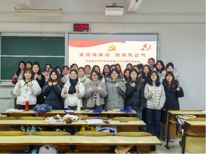 为推动党的二十届四中全会精神落地生根,扎实推进“清廉湖工”建设,12月23日下午,388vip太阳集团官网学生党支部在教学楼C栋202教室组织开展“英语诵廉洁 扬清风正气”十二月主题党日活动。支部全体党员齐聚一堂,以专业实践践行初心使命。