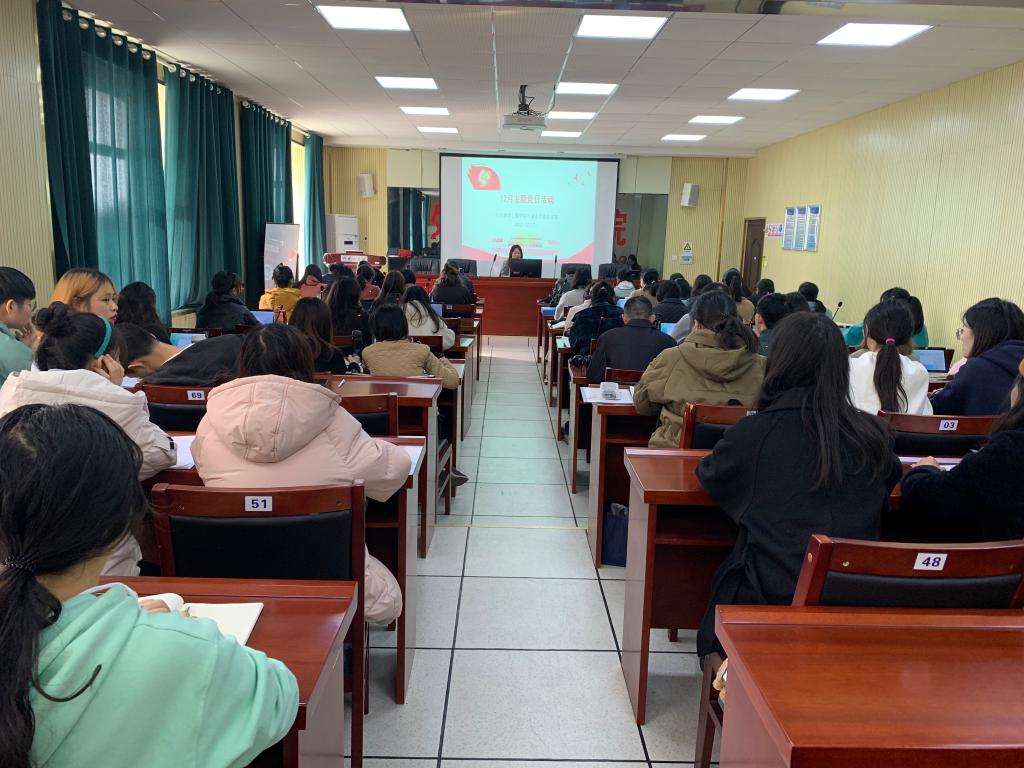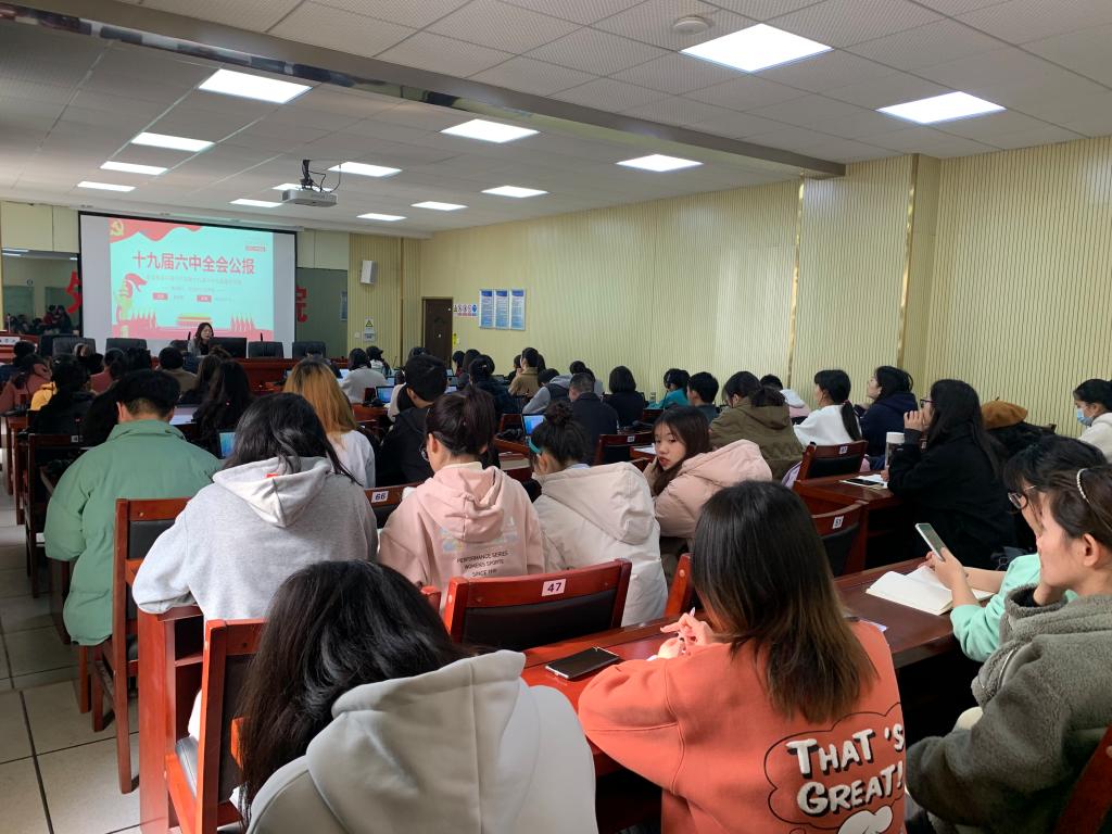 党的十九届六中全会是在重要历史关头召开的一次具有重大历史意义的会议。是以史为鉴、开创未来,实现中华民族伟大复兴的行动指南。为深入学习党的十九届六中全会精神,388vip太阳集团官网党总支部于12月7日下午在F309举行12月党日活动,党总支书记陈亚琼讲主题党课,带领全院教职工党员和学生党员共同学习十九届六中全会精神。